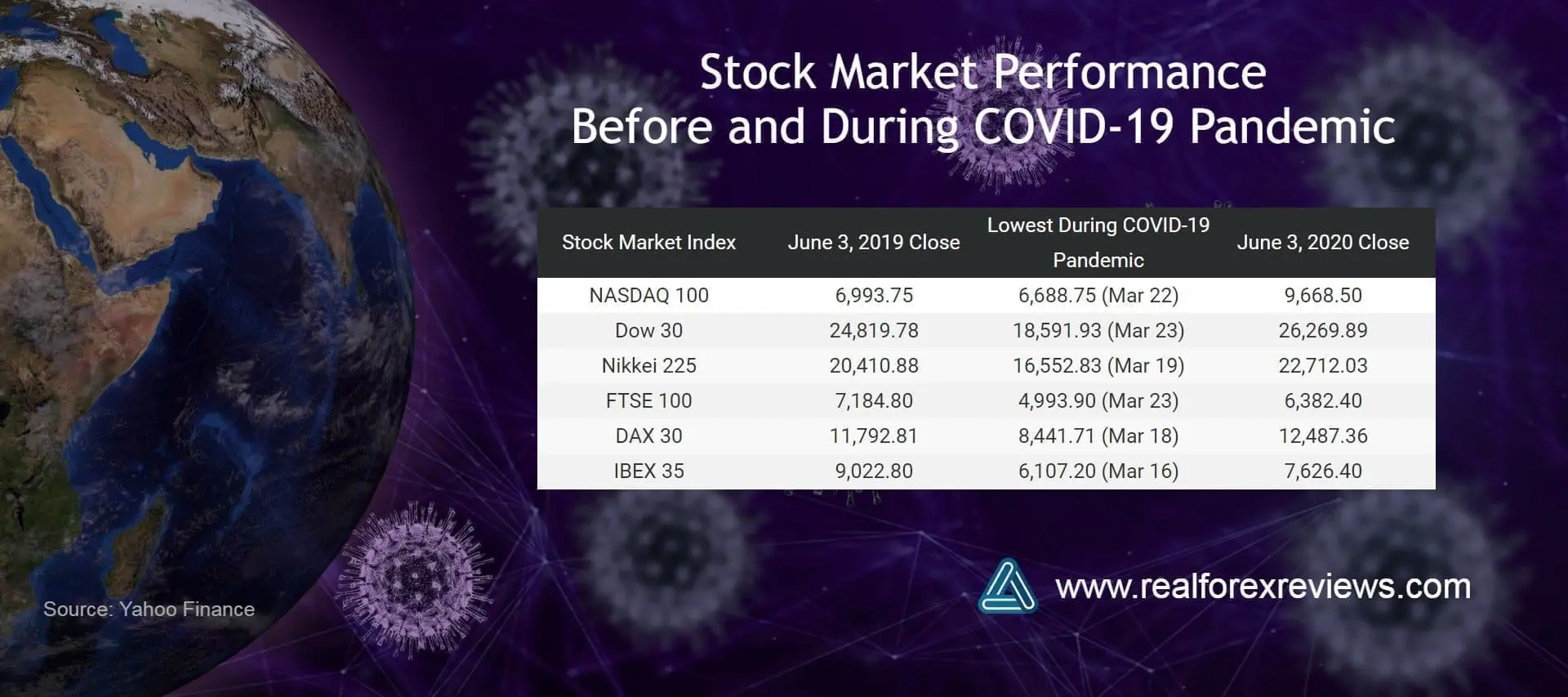 This is the common question nowadays of most traders while we are still in the middle of a pandemic.   But one thing is certain: There’s no other way but up. In fact, some markets are already improving and the recovery has been spectacular.   Our financial experts have made a table of global stock markets and how they performed a during the early stages of the pandemic, their current value and how it compares to their value a year ago.   Below is the chart that we’ve created based on their closing values: